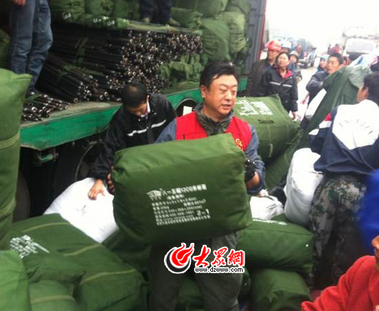 大眾網(wǎng)濟(jì)南4月23日訊(記者 王磊)“我們已抵達(dá)蘆山縣,今天與藍(lán)天救援隊一起裝卸救援物資。”今天下午,在蘆山縣第三小學(xué)附近的救援物資轉(zhuǎn)運(yùn)站,山東公益救援分隊汲春鋒等3人已冒雨奮戰(zhàn)了8個小時,凌晨隨救援車隊進(jìn)入震區(qū)后,他們僅休息了不到3個小時,就立即加入到了裝卸救援物資的隊伍。