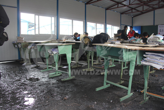 學生們在坑洼積水的板房教室內復課。24日,四川省副省長黃彥蓉要求希望工程隊當天解決這個問題。大眾網特派記者 李兆輝攝