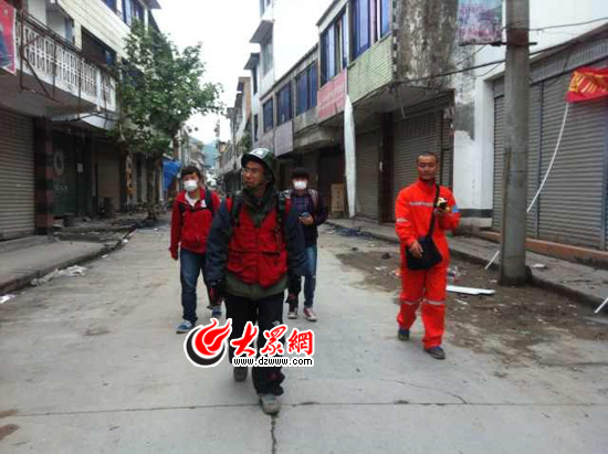 進入震區(qū)第二天,山東公益救援分隊的3名隊員深入到蘆山縣龍山鄉(xiāng)的山村參與救援。