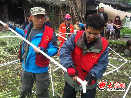 來到雅安地震的震中蘆山縣的第二天,今天上午,山東公益棗莊義工聯盟汲春鋒、宋將和魏先東3人經過與四川青年志愿者協會聯系,與2名志愿者組成臨時救援分隊,搭乘救援車輛來到了被大山包圍中的蘆山縣龍山鄉(xiāng)河心村,他們領到的任務是幫助這里的村民在安置區(qū)搭建帳篷。