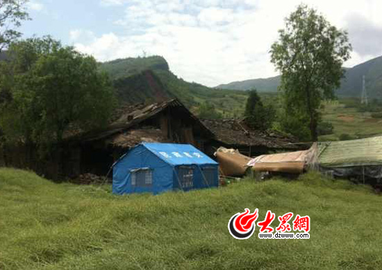 在一處危房外,山東公益救援分隊幫助村民搭建起的一頂藍色帳篷。