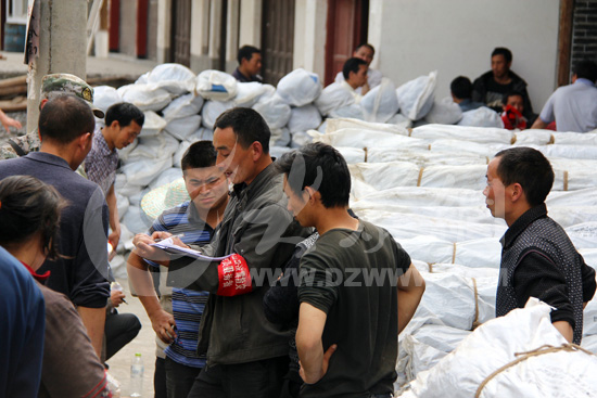 卸完貨后,中壩村會計楊平核對物資數(shù)量,迫不及待的村民圍在他身邊,等待簽字領取物資。大眾網(wǎng)特派記者尹海洋 攝