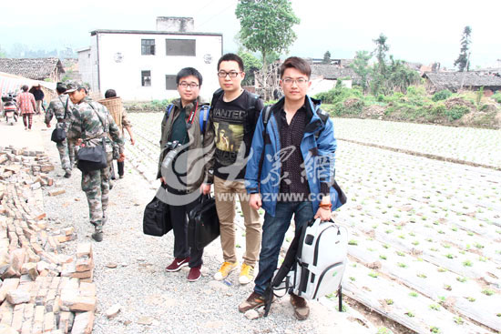 特派記者盛堃(中)、尹海洋(右)、李兆輝(左)在蘆山縣龍門鄉(xiāng)留下的合影。