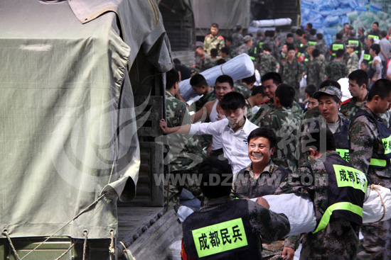 4月25日上午10點,來自成都市浦江縣的民兵在忙著為前往寶盛鄉的車輛裝帳篷。此時,他們累并快樂著。大眾網特派記者尹海洋 攝