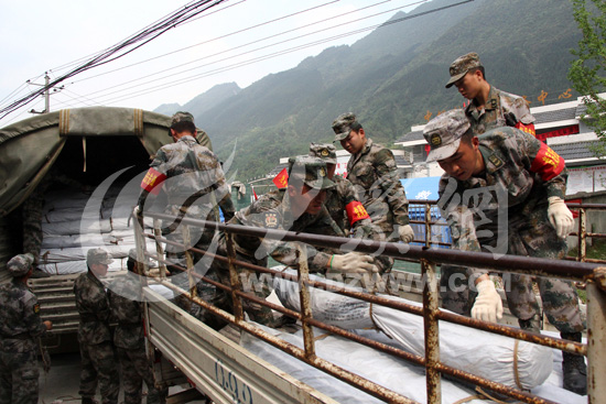 4月25日下午3點,物資順利抵達寶盛鄉中壩村,駐扎在此的成都軍區鐵拳師雷霆團的戰士緊急卸貨。大眾網特派記者尹海洋 攝