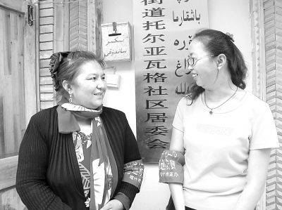 吾尼切木·瓦依提書記(左)正在社區門前的治安崗前值班。光明日報記者 王瑟攝 汽車在新疆喀什市老城區里穿行,路邊總看到一堆堆的建筑垃圾。同行的街道辦領導告訴我:“這里是喀什老城區改造最難的核心區域,居民住房緊張,失業人口最多,工作相當難做。但吾尼切木·瓦依提書記卻在這里工作了十多年,她對這里的每一戶情況都很熟悉,群眾也喜歡她。”