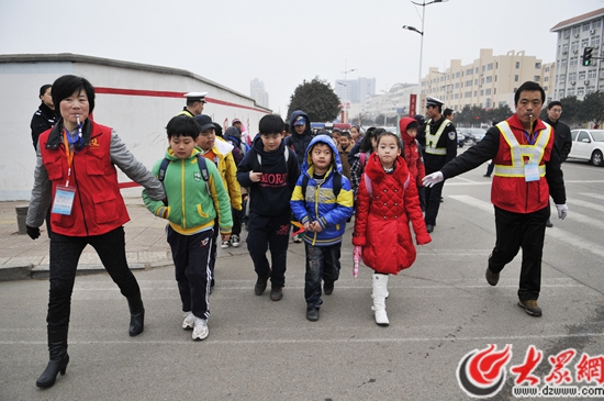 2012年3月1日,山東省日照市新營小學路口,汪麗麗(左一)和丈夫鄧立剛(右一)護送學生過馬路。