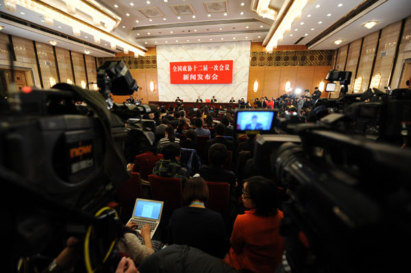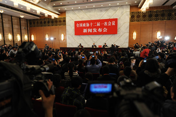 3月2日,全國政協十二屆一次會議新聞發布會在人民大會堂一樓新聞發布廳召開。新華網/中國政府網 陳競超 攝 3月2日,全國政協十二屆一次會議新聞發布會在人民大會堂一樓新聞發布廳召開。新華網/中國政府網 陳競超 攝
