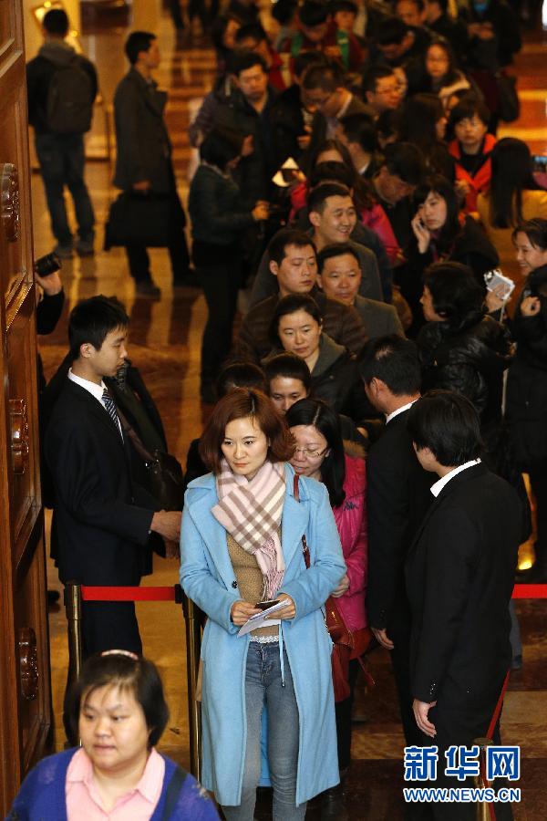 3月1日,參加全國政協十二屆二次會議采訪報道的記者在位于北京的全國政協禮堂排隊領取證件。新華社記者 沈伯韓攝