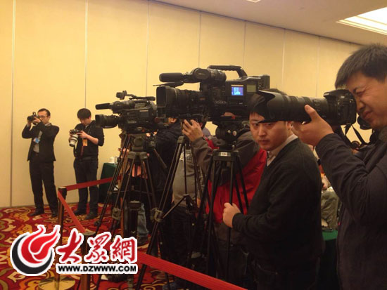 山東代表團(tuán)開放日現(xiàn)場,大眾網(wǎng)特派記者(右一)在現(xiàn)場進(jìn)行報(bào)道。