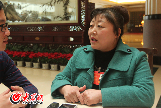全國(guó)人大代表、山東三箭置業(yè)有限公司油漆工陳雪萍接受大眾網(wǎng)記者采訪。特派記者 尹海洋 攝