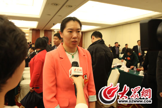 3月7日上午,山東代表團全體會上,全國人大代表、奧運會冠軍、山東省乒乓球運動管理中心女子乒乓球隊運動員李曉霞接受大眾網記者采訪。特派記者 尹海洋 攝