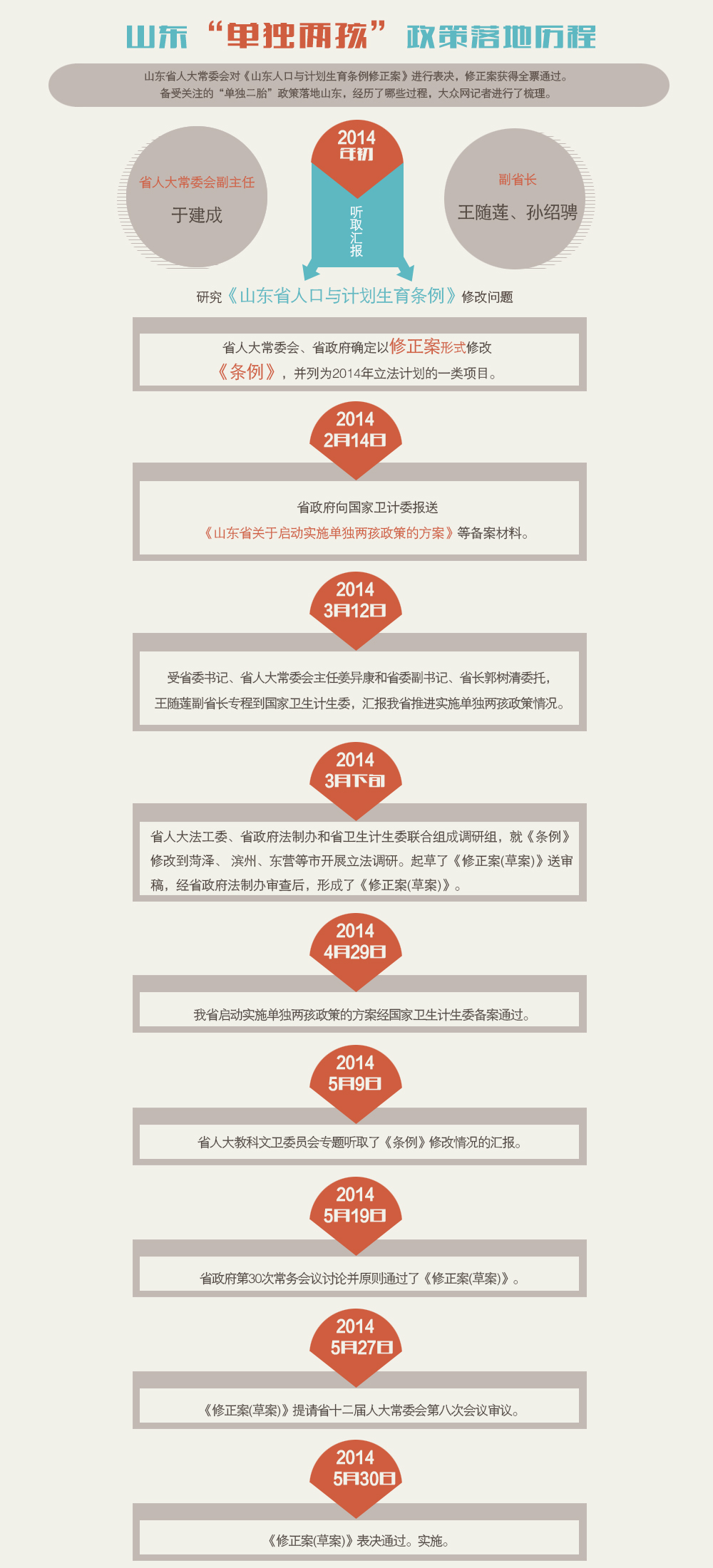 大眾網濟南5月30日訊(記者 于瀟瀟)今天下午,山東省人大常委會對《山東人口與計劃生育條例修正案》進行表決,修正案獲得全票通過。山東將于5月30日起實施“單獨兩孩”政策。備受關注的“單獨二胎”政策落地山東,經歷了哪些過程,大眾網記者進行了梳理。