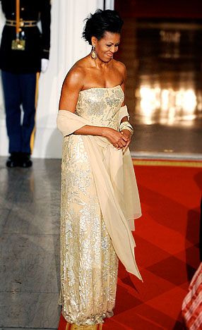 1. 2009年美國白宮政府晚宴,身著Peter Soronen薄暮無帶晚禮服搭配Tom Binns配飾。