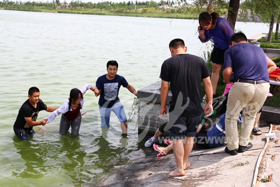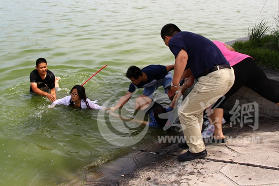 岸上的人們把邢思睿扶上岸,張先生現場拍攝。