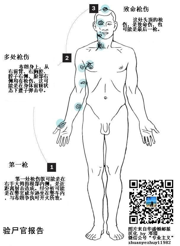 截止到這時(shí),各方證詞基本一致,威爾遜的執(zhí)法行為也無(wú)可指摘。而此后所發(fā)生的事的各方證詞表述就出現(xiàn)了較大差異:布朗和約翰遜在威爾遜開(kāi)槍后轉(zhuǎn)身奔逃,約翰遜躲到一輛車(chē)后面,威爾遜向布朗追去但距離越拉越遠(yuǎn)。約翰遜和部分目擊者的證詞是威爾遜在布朗逃跑過(guò)程中開(kāi)槍?zhuān)栠d則聲稱(chēng)在此過(guò)程中沒(méi)有開(kāi)槍。此時(shí),布朗停步轉(zhuǎn)身對(duì)著威爾遜,約翰遜和部分目擊者的證詞是布朗舉起雙手并說(shuō)“我沒(méi)有槍”,向前邁了半步,沒(méi)有攻擊傾向。而威爾遜則說(shuō)布朗握拳向他沖過(guò)來(lái)。因此他連開(kāi)數(shù)槍?zhuān)祭手袠屗さ梗栠d繼續(xù)開(kāi)槍?zhuān)詈髢蓸寭糁胁祭暑^頂,是貫穿傷。威爾遜總計(jì)開(kāi)了12槍?zhuān)渲杏?顆子彈擊中了布朗身體。