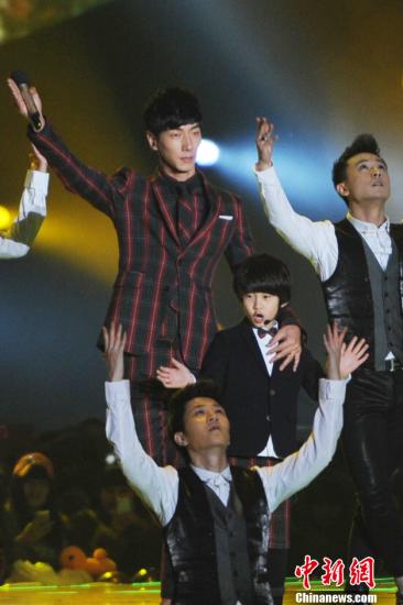 2013年12月31日晚,湖南衛(wèi)視2013-2014年跨年演唱會熱鬧上演。圖為張亮攜子“天天”登臺獻(xiàn)唱。中新網(wǎng)記者 張龍云 攝