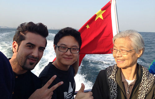 臨沂大學舞蹈學院大一新生陸遠(左二)在臨沂大學體育場,與國旗合影,...