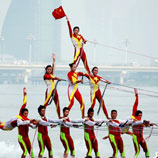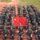 臨沂大學舞蹈學院大一新生陸遠(左二)在臨沂大學體育場,與國旗合影,用跳躍的一字馬為中國點贊。在今...