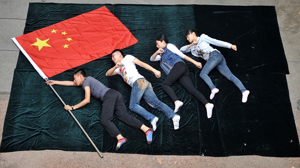 9月25日,山東聊城大學美術學院大學生舉辦我和國旗合個影活動,圖為“跟著國旗方向走”。