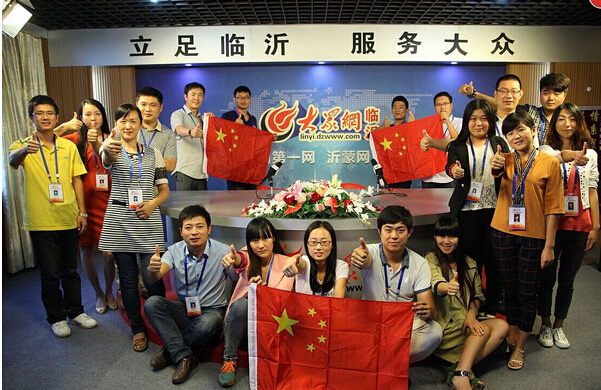 大眾網臨沂記者站工作人員和國旗合影,為中國點贊。