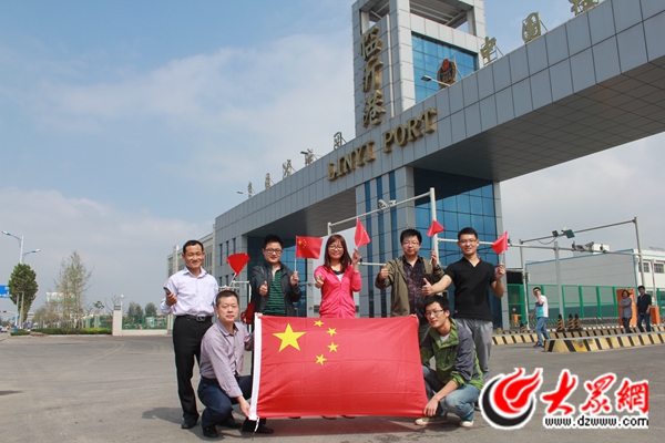 9月29日,臨沂港工作人員在臨沂港門前與國旗合影,為中國點贊。