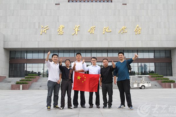 臨沂沂蒙革命紀念館工作人員在紀念館前與國旗合影為中國點贊