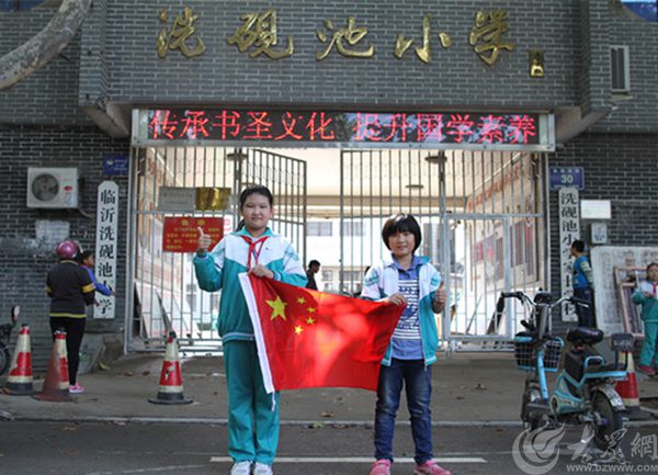 六年級學生李莉和肖萍在臨沂洗硯池小學門口與國旗合影為中國點贊