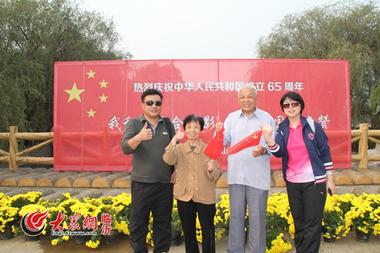 9月29日上午,來自武漢、河南的4名游客,在臨沂書法廣場與國旗合影。