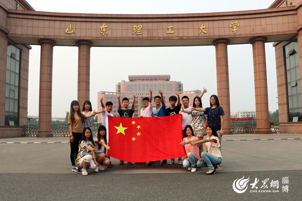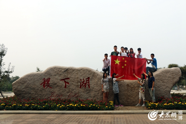 山東理工大學文學院的學生在理工大學南門和稷下湖邊與國旗合影,為祖國點贊送祝福。