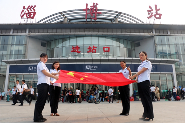 淄博火車站工作人員和國旗合影,為中國點贊。