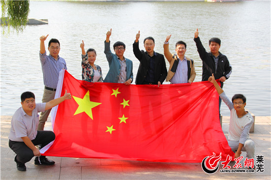 大眾網(wǎng)萊蕪記者站工作人員和國旗合影,為中國點贊。