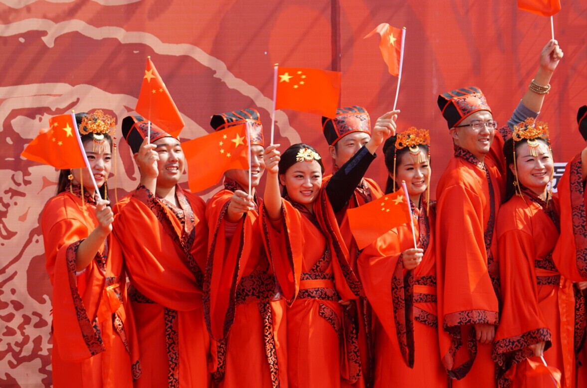 山東省日照市,“九點陽光?東關里”日照2014年青年漢式集體婚禮現場,18對新人與國旗合影,為祖國點贊。