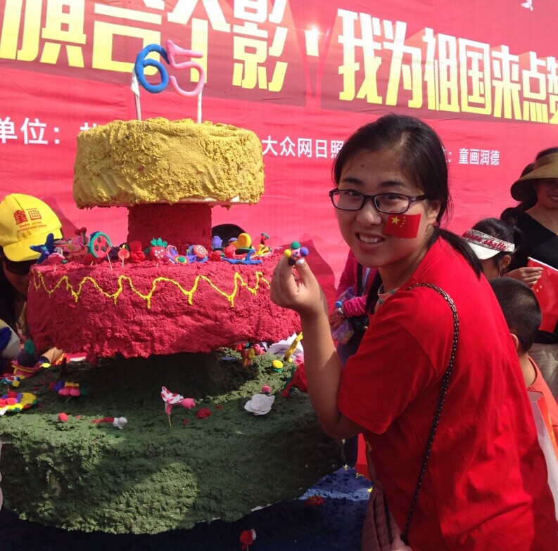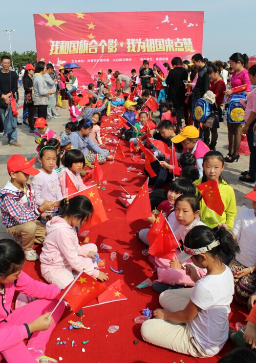 日照市萬平口景區,“我和國旗合個影 我為祖國來點贊”活動現場,小朋友們手拿國旗與國旗合影,為祖國點贊。