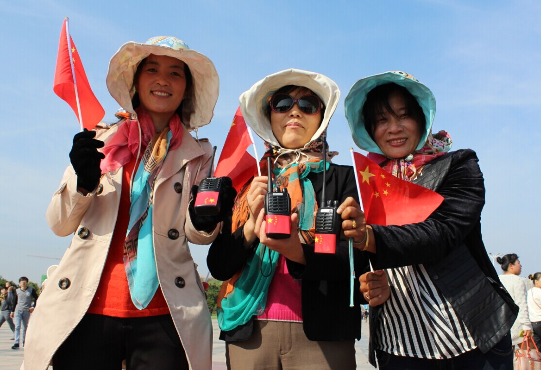 日照市萬平口景區,三位景區環衛大姐與國旗合影,為祖國點贊。