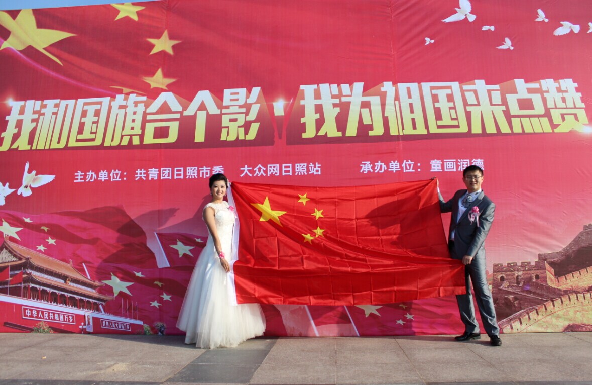 日照市萬平口景區,一對新人與國旗合影,為祖國點贊。