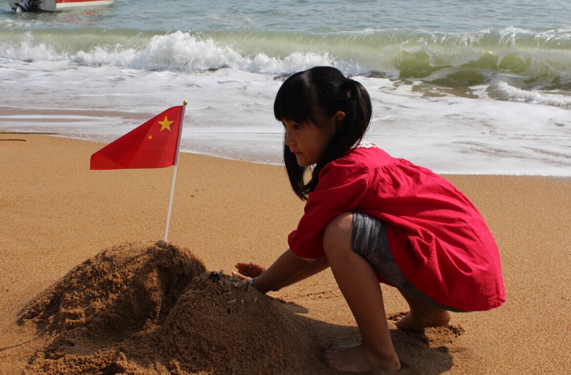 山東省日照市,一位小姑娘在第一海水浴場沙灘上與國旗合影,為祖國點贊。