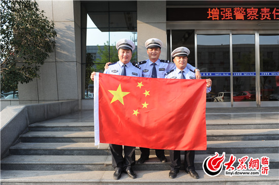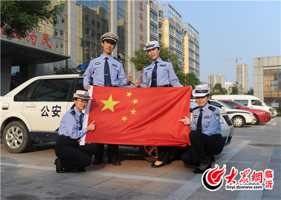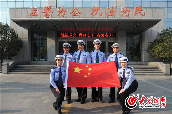 臨沂直屬一大隊(duì)民警與國(guó)旗合影,為中國(guó)點(diǎn)贊