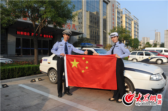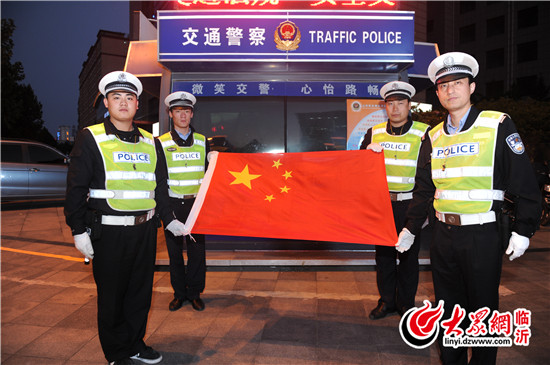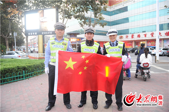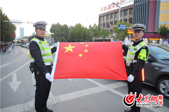 臨沂直屬一大隊(duì)執(zhí)勤民警在金雀山路與沂州路交會(huì)處,與國(guó)旗合影,為中國(guó)點(diǎn)贊