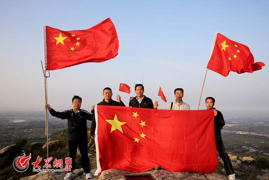 臨沭縣蒼馬山景區(qū)游客與國(guó)旗合影,為中國(guó)點(diǎn)贊