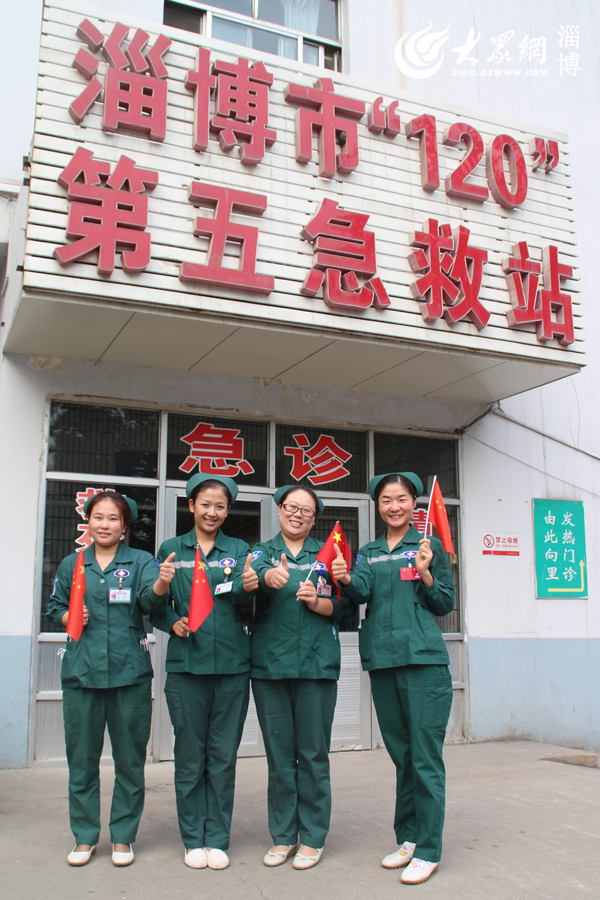 張店區(qū)中醫(yī)院急診科“四朵金花”在淄博市“120”第五急救站門前為“國旗”點贊(趙凱 攝)