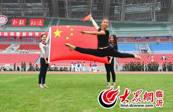 臨沂大學舞蹈學院大一新生陸遠(左二)在臨沂大學體育場,與國旗合影,用跳躍的一字馬為中國點贊。