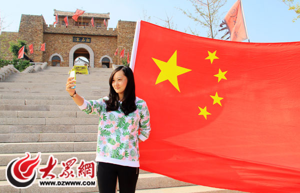 在沂南紅石寨,美麗的網友用手機自拍與國旗合影,為祖國點贊!