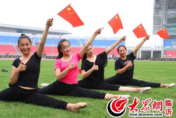 臨沂大學舞蹈學院女生在臨沂大學體育場,用一字馬與國旗合影,為中國點贊。