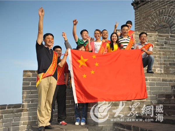 威海長城愛心大本營成員,在長城頂峰和國旗合影