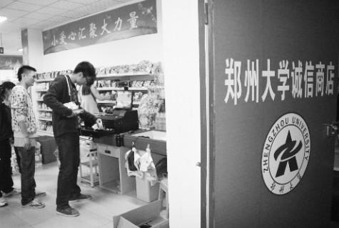 這家名為“鄭州大學誠信商店”的超市,是由鄭州大學學生處建立并且經營的。從掃描條形碼到支付、找零,整個付款流程全由前來購物的學生自行操作收款機完成。 “‘誠信商店’就是要讓同學們自覺做到誠信。試營業近2個月了,還沒有出現過‘不誠信’的行為。”負責整理貨物的張阿姨說到。