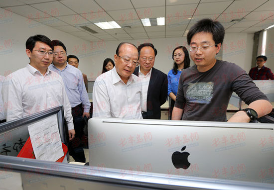 全國(guó)"掃黃打非"工作小組專職副組長(zhǎng)李長(zhǎng)江(中)視察半島網(wǎng)。王濱 攝