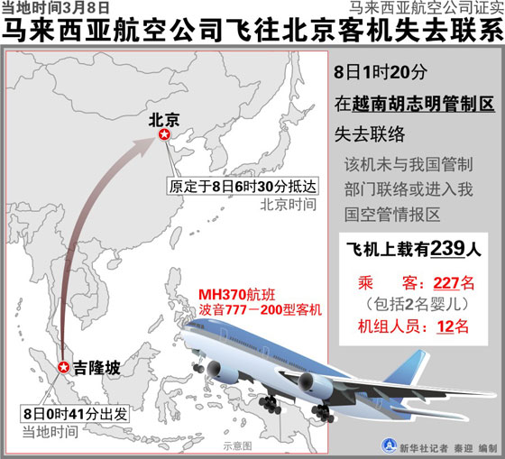 #馬航飛機(jī)失聯(lián)#【一載239人由吉隆坡飛北京的航班失聯(lián) 機(jī)上有160名中國人】馬來西亞航空發(fā)表聲明說,該公司一架從吉隆坡飛往北京的航班失去聯(lián)絡(luò)。該飛機(jī)航班號為MH370,機(jī)型波音777-200,載有239人,包括兩名嬰兒。原定今早6時(shí)30分抵達(dá)北京;在越南曾與空管聯(lián)系后失聯(lián)。目前搜索工作已展開。祈禱平安!