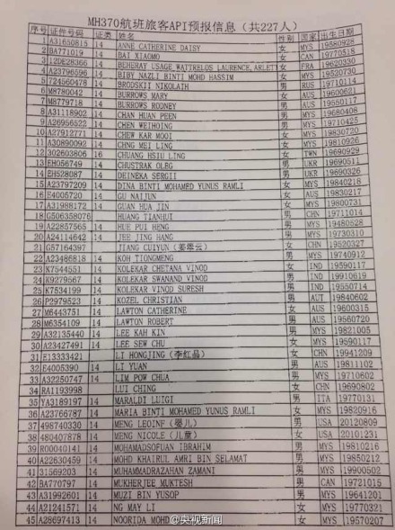 #馬航飛機(jī)失聯(lián)#【MH370航班乘客名單】馬來西亞航空公司飛往北京的MH370航班,于凌晨2:40失聯(lián)。機(jī)上共有239人,載有154名中國乘客。據(jù)邊檢提供的名單,機(jī)上有兩名中國幼童(一男一女)。