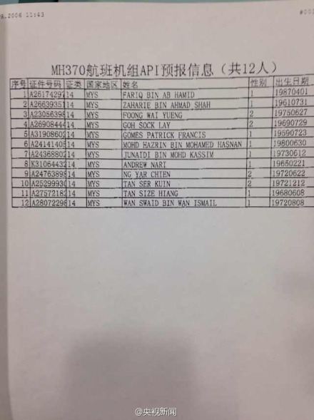 #馬航飛機(jī)失聯(lián)#【航班飛行員53歲 副機(jī)長27歲】①該航班與南航有航班共享代碼。②飛行員現(xiàn)年53歲,自1981年起加入馬航,累計(jì)飛行時(shí)數(shù)達(dá)18365小時(shí)。③副機(jī)長今年27歲,有2763小時(shí)飛行經(jīng)驗(yàn)。④機(jī)長和副機(jī)長都是馬來西亞人。